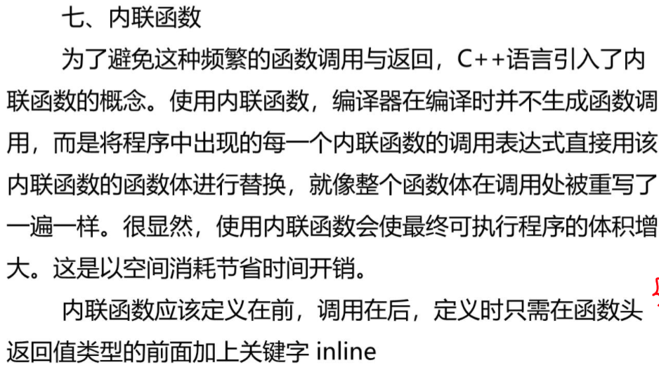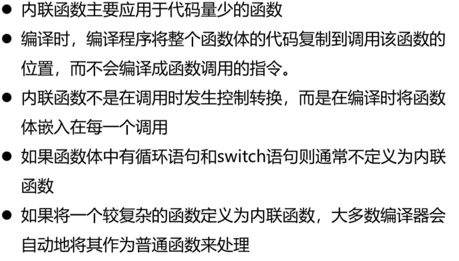 | inline | inline(内联)函数的定义将在编译时在调用处展开。inline 函数一般由短小的语句组成,可以提高程序效率。 |