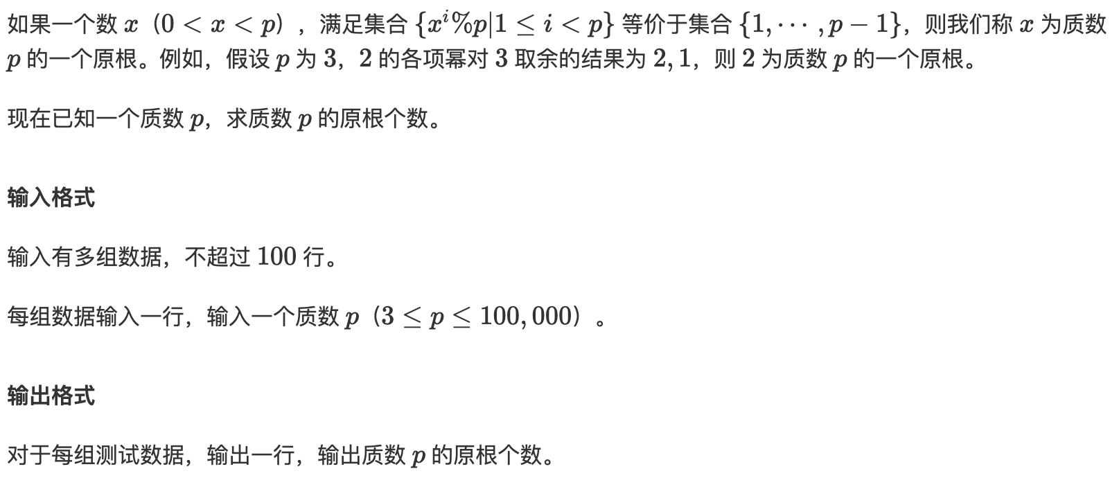 这道题用到的就是博客里的定理2: 每一个素数p都有ϕ(p−1)个原根。事实上, 每一个数m都有ϕ(ϕ(m))个原根(如果有的话).