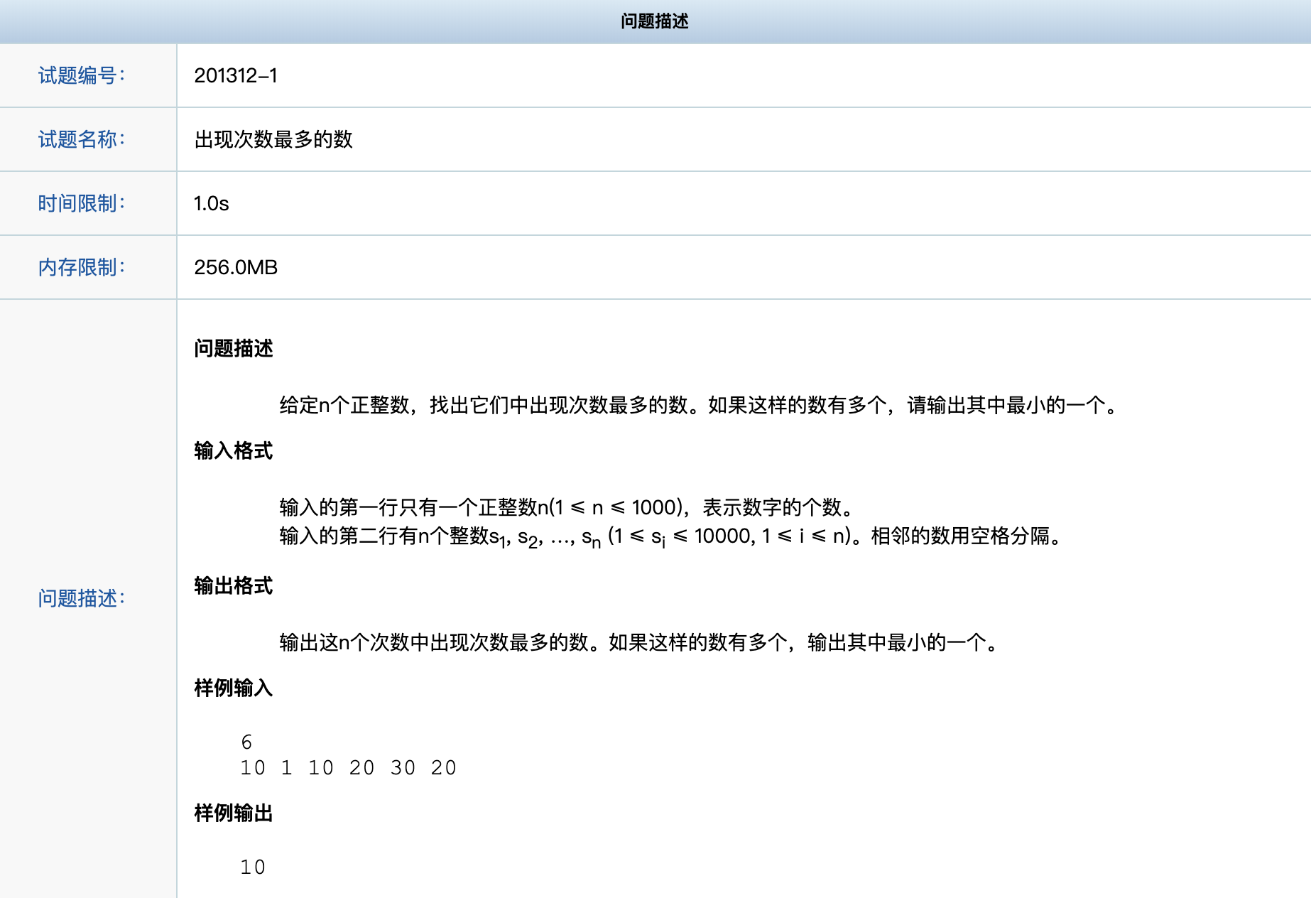 利用一个数组记录每个数出现的次数(数组下标是出现的数,数组的值是出现数的次数). 边输入边统计,在统计的同时,用一个变量记录出现次数的最大值. 最后通过一次遍历(从最小的数开始),一旦发现出现次数与出现次数最大值相同的值,就输出数组下标. 需要分清楚数字的个数和数字的大小范围(数组大小不要开错).