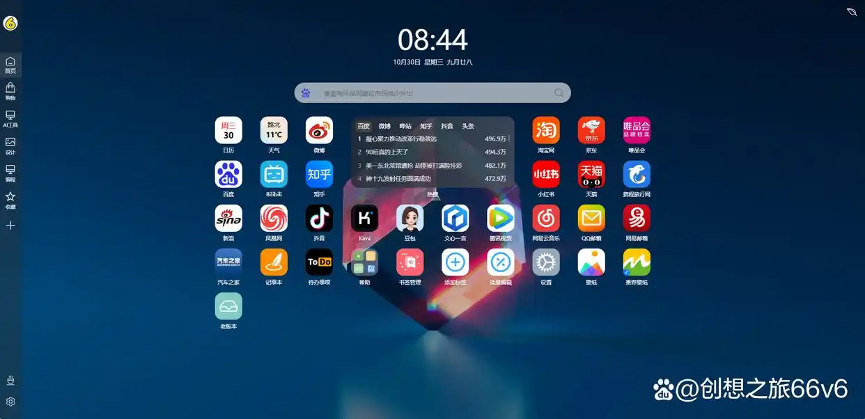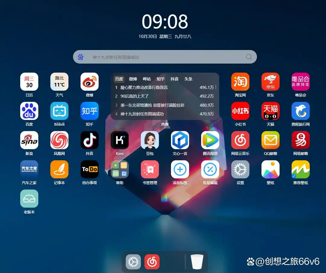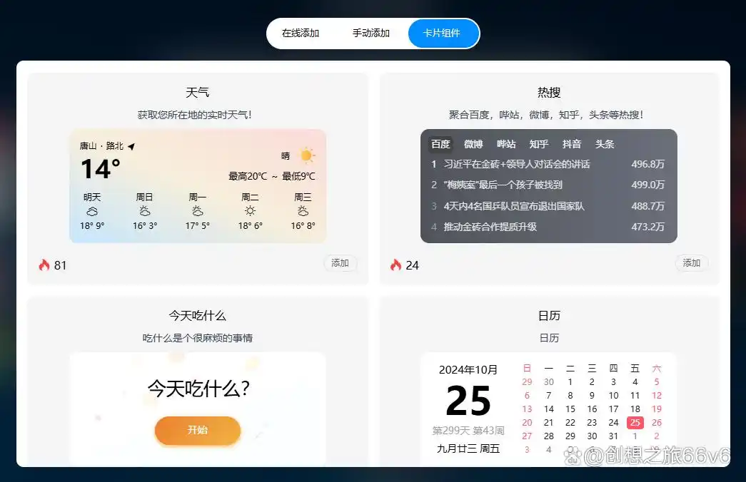 6、内部小卡片:天气、日历、倒计时、热搜等,满足不同需求。