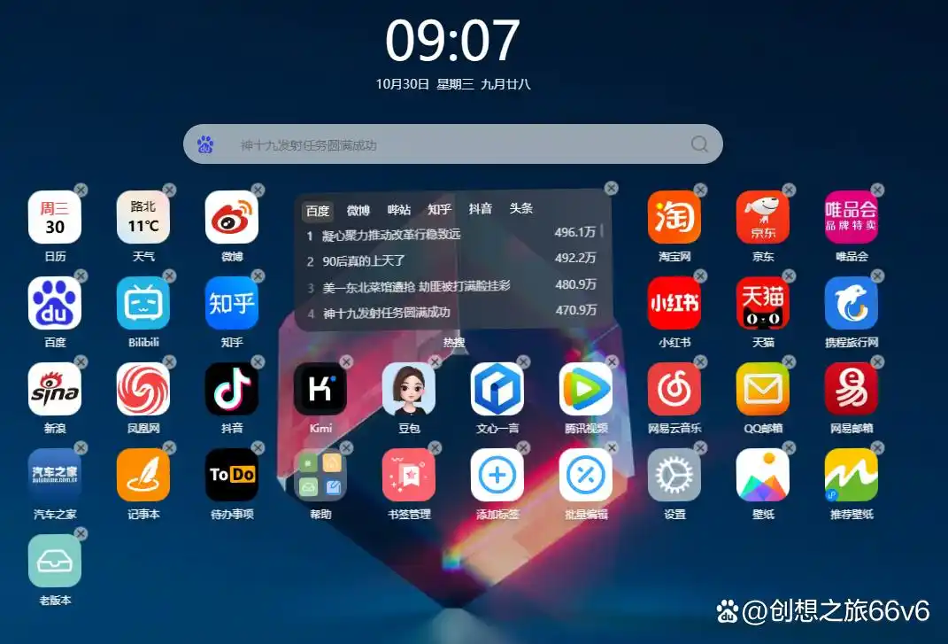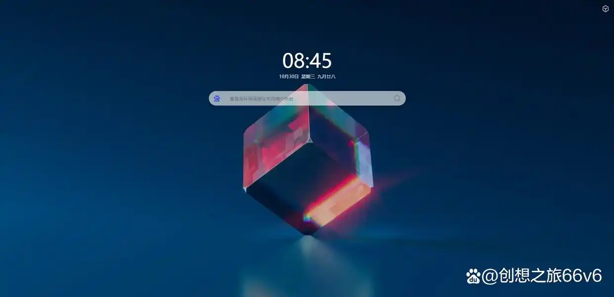 在极简模式下,整个页面变得异常简洁,只留下时间、搜索框和几个最重要的网站图标,非常适合需要专注时使用。而当你想要探索更多内容时,只需一键切换回正常模式,各类小卡片和网站链接便跃然眼前,应有尽有。