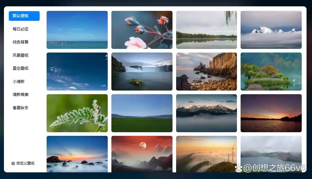 5、设置更改背景图片:预设了很多漂亮的图片,满足大部分人。首页还有一些外部的自动更换的图片链接,适合喜欢每天更换图片的朋友,在自定义壁纸里保存链接即可。