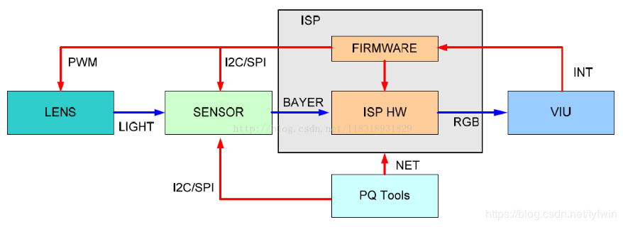 如图所示,lens 将光信号投射到sensor 的感光区域后,sensor 经过光电转换,将Bayer 格式的原始图像送给ISP,ISP 经过算法处理,输出RGB空间域的图像给后端的视频采集单元。在这个过程中,ISP通过运行在其上的firmware(固件)对ISP逻辑,从而对lens 和sensor 进行相应控制,进而完成自动光圈、自动曝光、自动白平衡等功能。其中,firmware的运转靠视频采集单元的中断驱动。PQ Tools 工具通过网口或者串口完成对ISP 的在线图像质量调节。