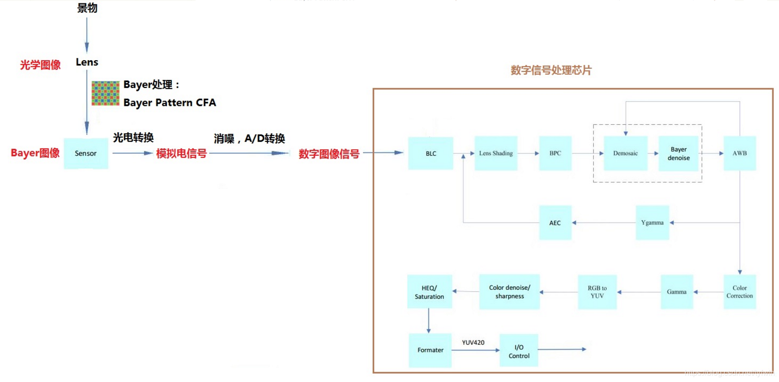 Bayer、黑电平补偿 (black level compensation)、镜头矫正(lens shading correction)、坏像素矫正(bad pixel correction)、颜色插值 (demosaic)、Bayer 噪声去除、 白平衡(AWB) 矫正、 色彩矫正(color correction)、gamma 矫正、色彩空间转换(RGB 转换为 YUV)、在YUV 色彩空间上彩噪去除与边缘加强、色彩与对比度加强,中间还要进行自动曝光控制等, 然后输出 YUV(或者RGB) 格式的数据, 再通过 I/O 接口传输到 CPU 中处理。