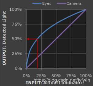 人眼对外界光源的感光值与输入光强不是呈线性关系的, 而是呈指数型关系的。 在低照度下,人眼更容易分辨出亮度的变化, 随着照度的增加,人眼不易分辨出亮度的变化。而摄像机感光与输入光强呈线性关系, 为方便人眼辨识图像, 需要将摄像机采集的图像进行gamma 矫正。