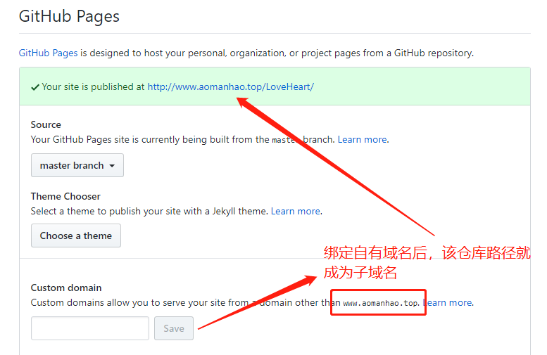 设置页面往下拉, github pages部分,选择一个主题,开启功能,根据显示域名就能访问爱礼页面了