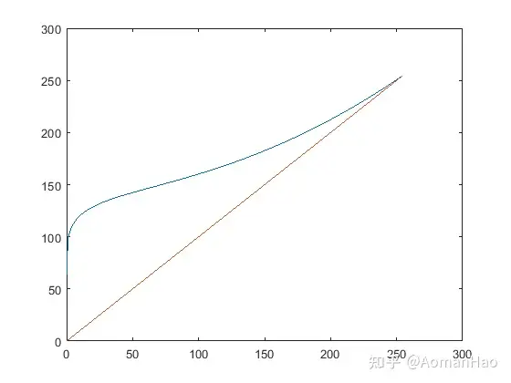 算法本质是暗区提亮gamma曲线映射实现,亮区不处理或者轻微处理。后续对比度处理精细化增强系数,需要多尺度高斯核函数卷积。 非线性gamma曲线如图下蓝线,线性映射如黄色线: