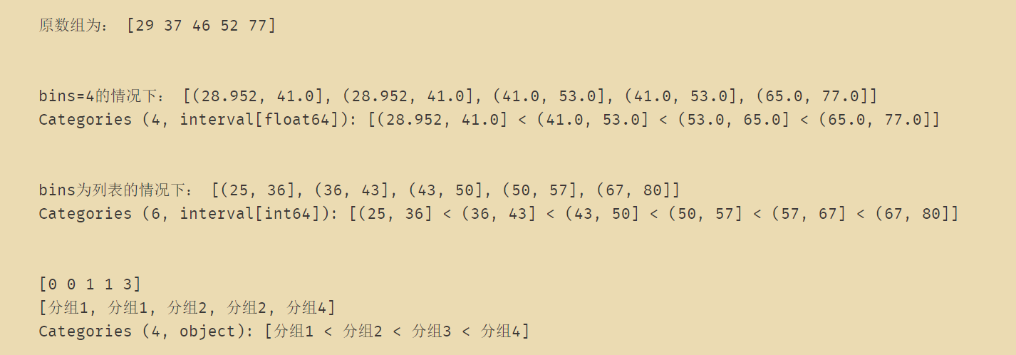 print('bins=4的情况下:',pd.cut(factors, 4))