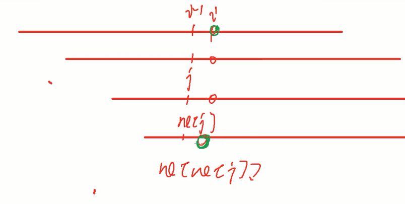然后看紫色圆圈与s[i]即绿色圆圈是否匹配,如果匹配说明我们可以继续往后做,如果不匹配,我们就递归的做这个过程,再把红色线向后移动ne[ne[j]]的位置,之后看是否匹配。