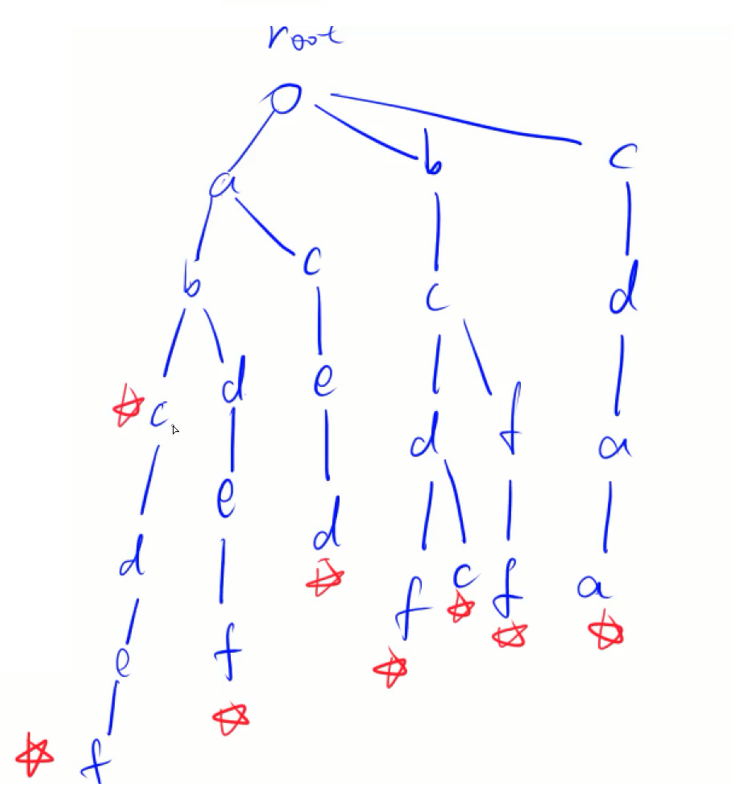 这个单词,如上图,会从root开始走,先走a,再走c,再走e,再走d,发现d上有红色结束标记,说明存在aced