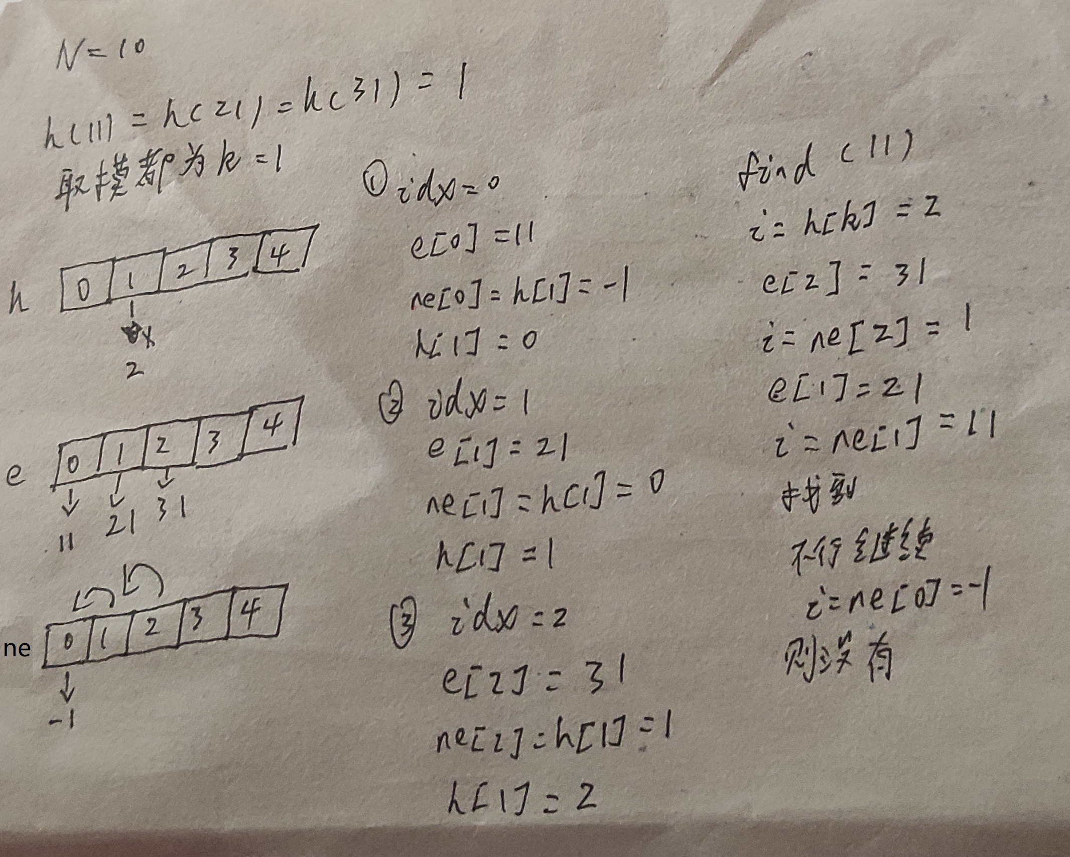 e[idx] = x, ne[idx] = h[k], h[k] = idx++; // 链表插入操作