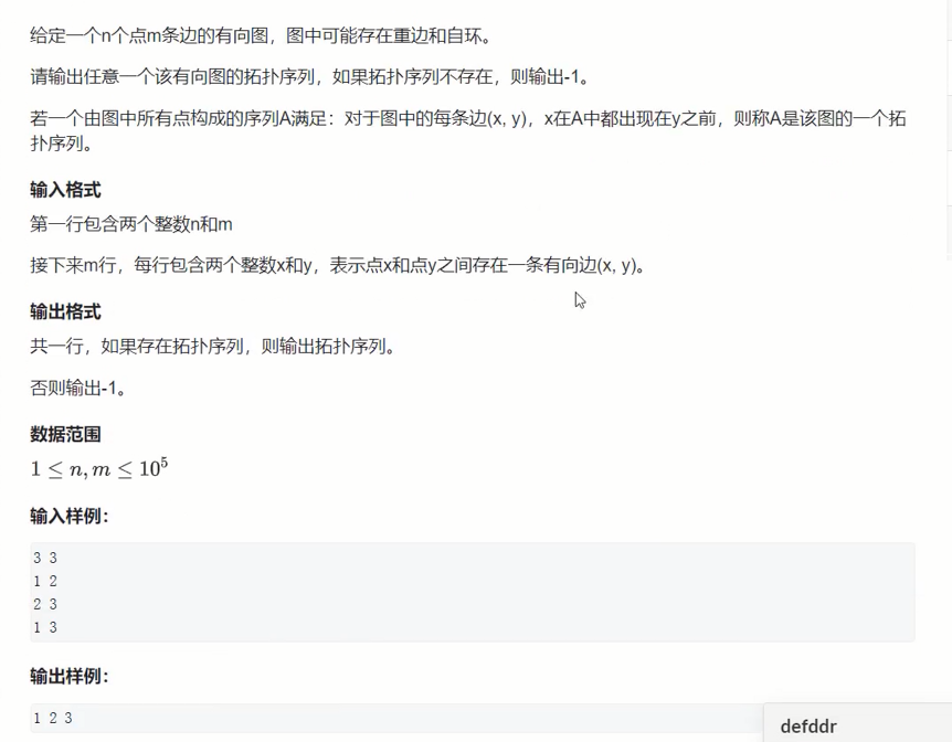 存在一个序列A,对于图中的每条边(x,y),x在A中都出现在y之前,则称A是该图的一个拓扑序列。