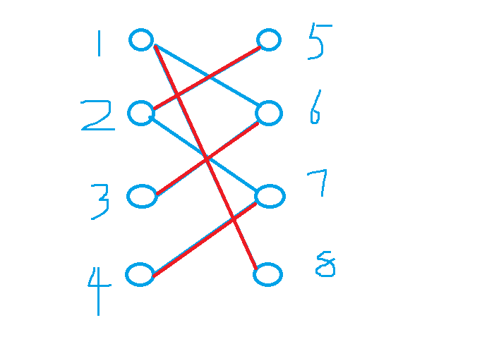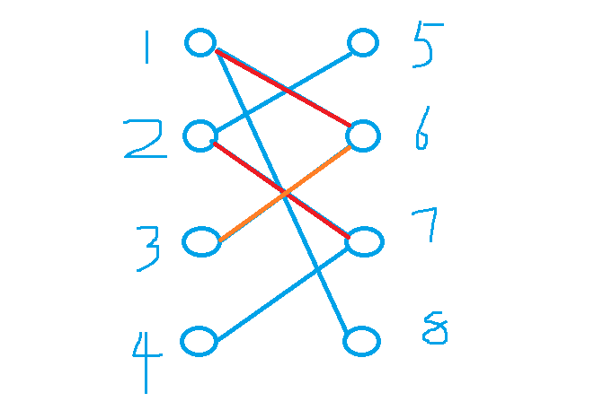 每次匹配时,如果当前匹配的点已经有人连接了如1,6,那么就要看看1有没有其他点可以选择,如果有就匹配其他点,如果不能那么就只能放弃了。