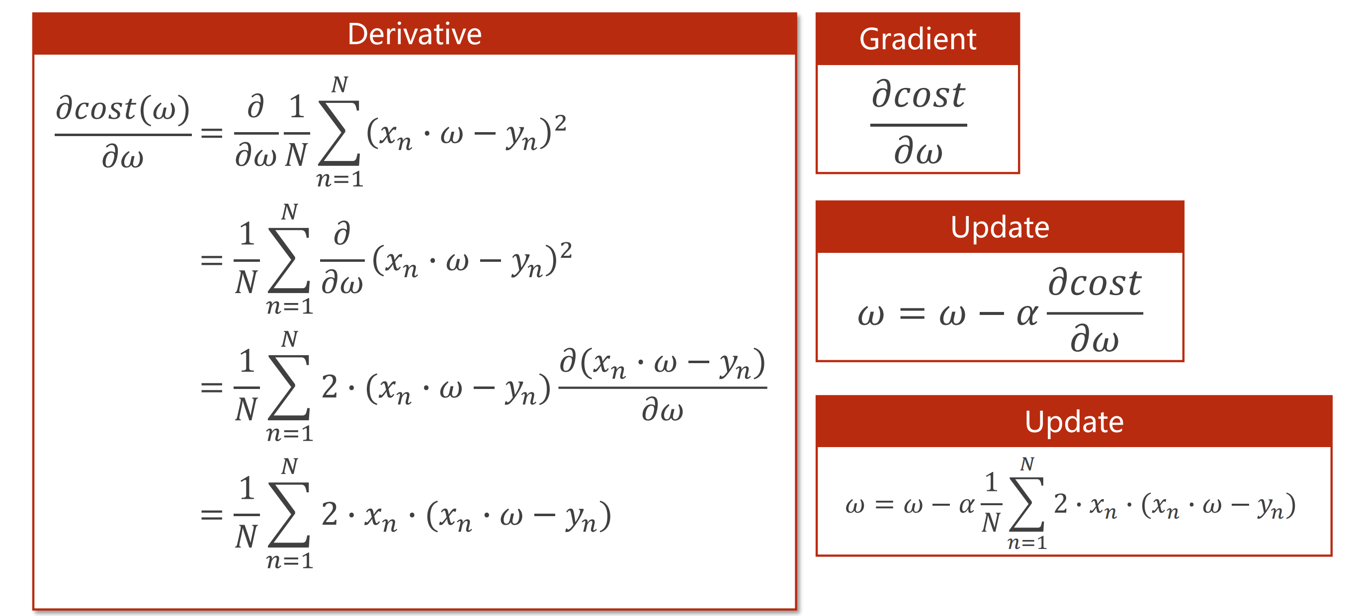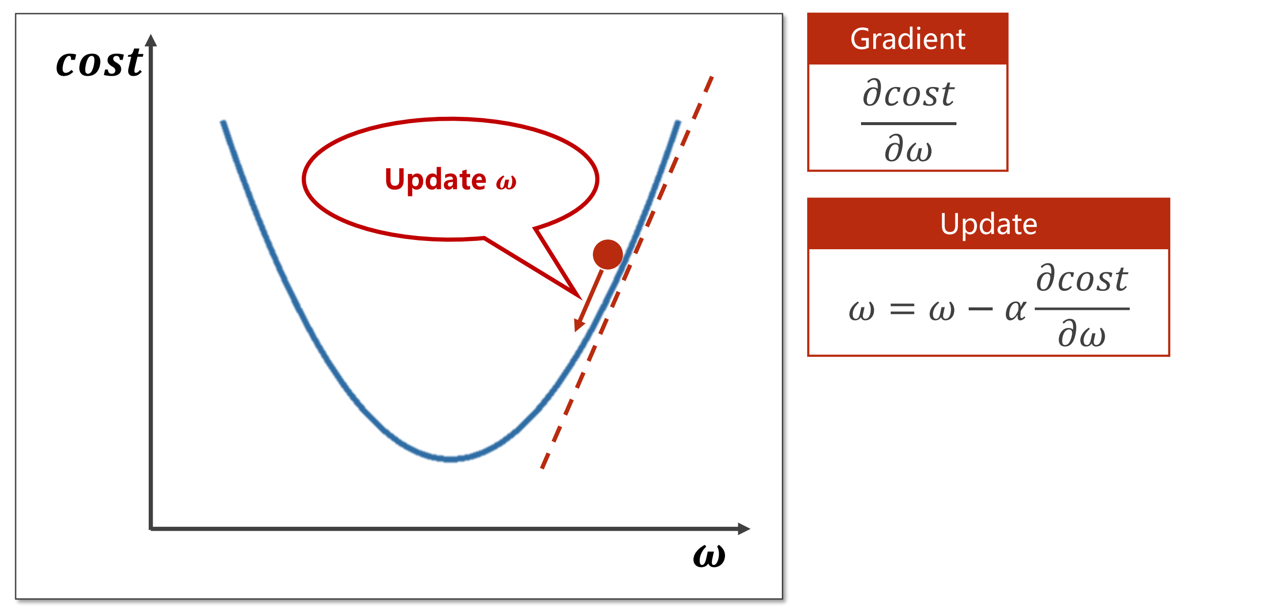 这个梯度实际就是导数,我们需要找到极值点,也就是导数为0的点。初始我们猜测了一个初始值后,我们需要判断这个点接下来是向左还是向右,根据梯度\(\frac{\partial cost}{\partial \omega}\)且我们需要找到一个最小的权重\(\omega\)可知,我们需要向导数的负方向走才会使值减小,所以梯度的更新策略是\(\omega = \omega - \alpha\frac{\partial cost}{\partial \omega}\)。我们梯度的定义实际就是我们的成长函数对权重进行求导数,这样我们就可以得到它的上升方向。之所以是上升方向是通过导数定义$\displaystyle \lim_{x \rightarrow \infty} \frac{f(x + \Delta x)-f(x)}{\Delta x} $可知,x加上一个数值之后他的函数值变大,说明这肯定是一个增函数,说明在数值的正方向它在上升,那我们就需要向它的反方向走。所以是减去。