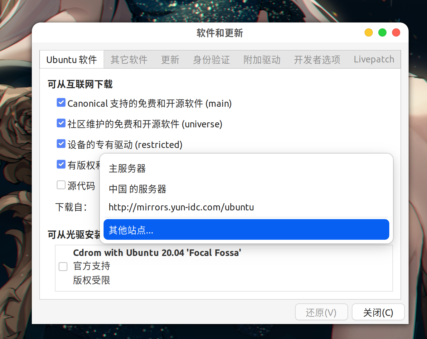 打开 Software & Updates 软件。选择其他站点,在里面选择中国服务器,选择最佳服务器即可