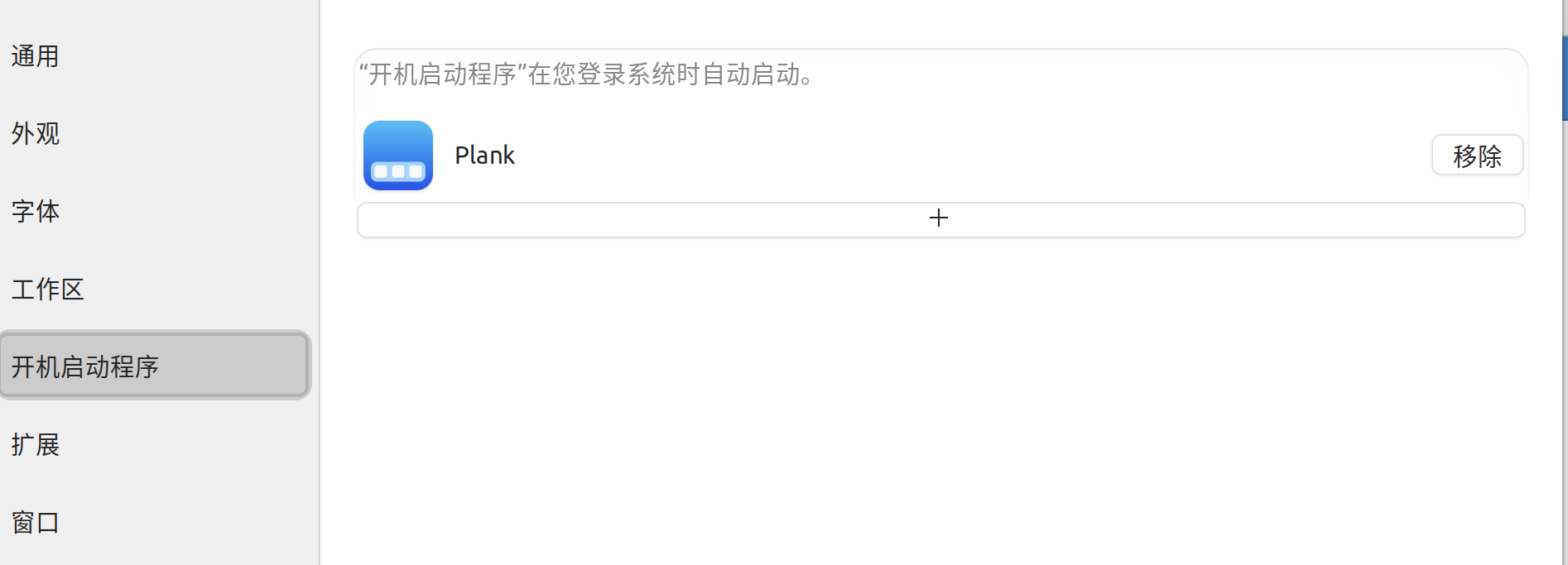 安装好后打开 gnome-tweaks 工具,设置 plank 为开机启动,如下图: