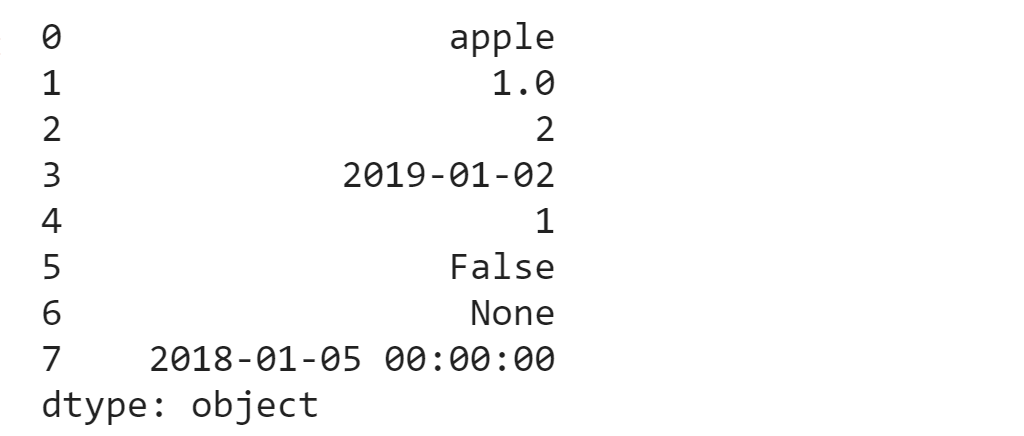s = pd.Series(['apple', '1.0', '2','2019-01-02',1, False,None,pd.Timestamp('2018-01-05')])