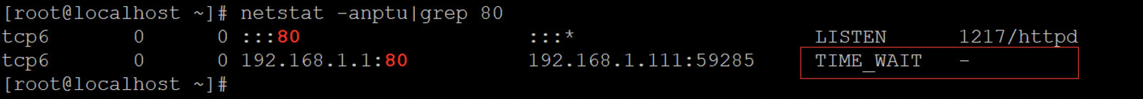 然后马上回到服务器上查看端口号,此时就会出现TIME_WAIT这个状态