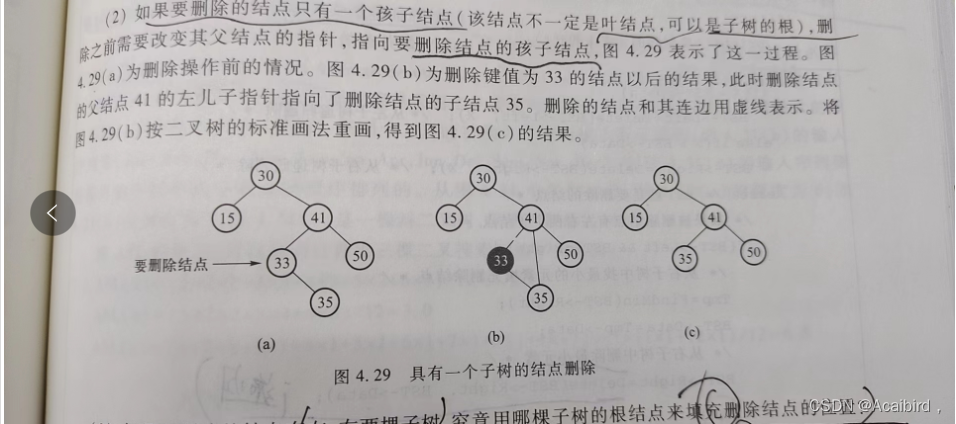 2)如果A有一个儿子B,A的父亲为C,则让B链接到C上;如果A为根节点,则让C为根节点。
