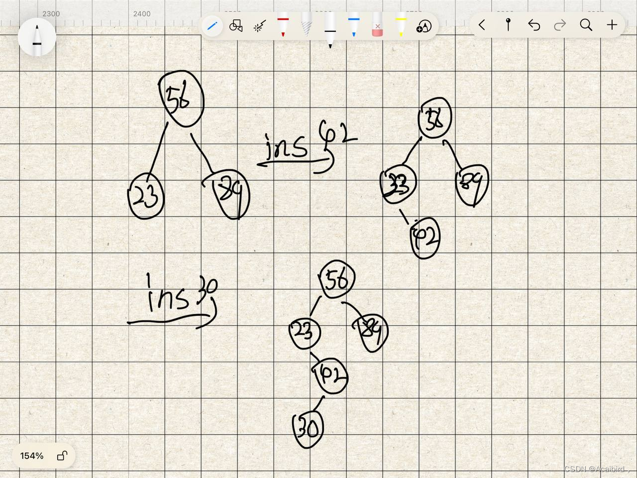如上图所示,插入30发现30小于56,去左边和23对比,发现大于23,去右边和42对比,发现小于30。正好左边为空,则插入在左边。