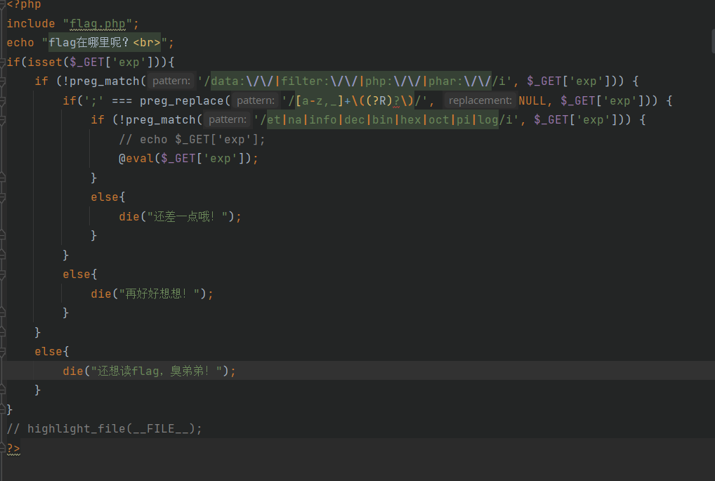 可以看到这里面很多过滤但是注意到了eval可以执行代码,但是有三层过滤