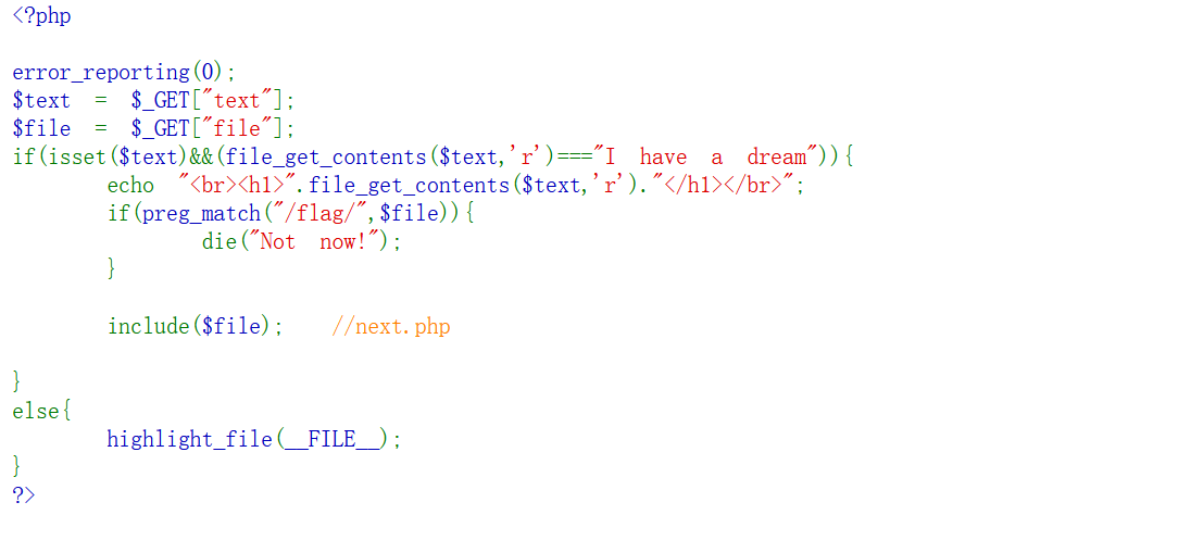 解读:使用get传入参数,要求使用file_get_contents读取text内容,需要和I have a dream全等,之后检查file的参数是否有flag,还有下面包含了next.php文件