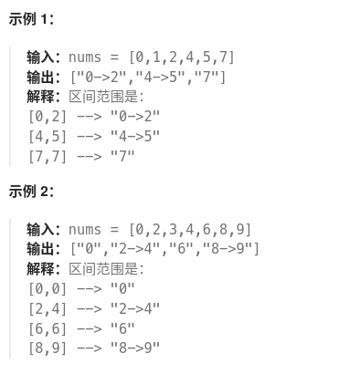 返回 恰好覆盖数组中所有数字 的 最小有序 区间范围列表 。也就是说,nums 的每个元素都恰好被某个区间范围所覆盖,并且不存在属于某个范围但不属于 nums 的数字 x 。