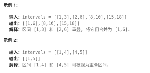 题目:以数组 intervals 表示若干个区间的集合,其中单个区间为 intervals[i] = [starti, endi] 。请你合并所有重叠的区间,并返回 一个不重叠的区间数组,该数组需恰好覆盖输入中的所有区间 。
