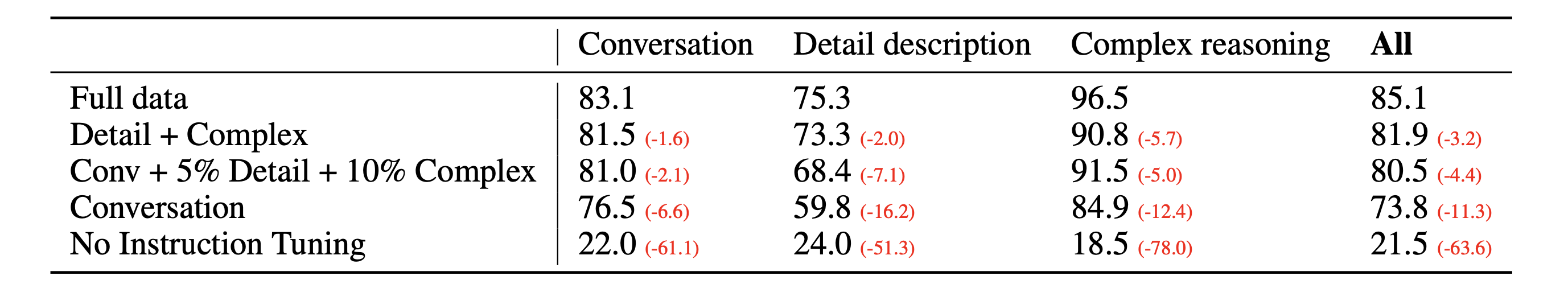 下表展示端到端微调阶段的三种训练数据使用情况对最终模型的影响,评价标准是 LLaVA-Bench(COCO)Benchmark。