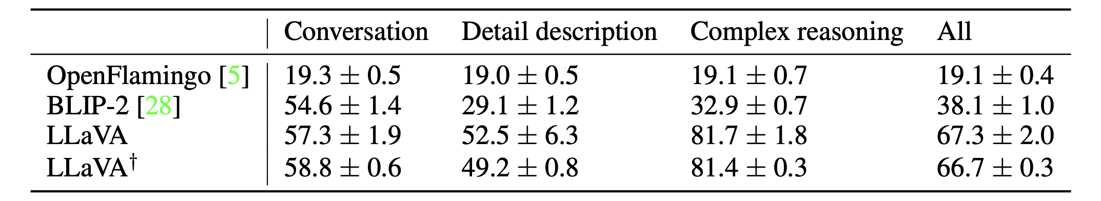 下表展示不同模型的表现,评价标准是 LLaVA-Bench(In-the-Wild)Benchmark。其中“†”匕首符号表示对 GPT-4 查询三次取均值以评估性能。