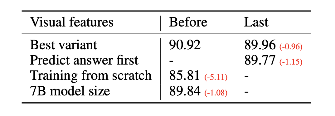 Predict Answer First 强制规定了回答中 Answer 和 Reason 的顺序,实验发现顺序对结果无影响,都是 89.77%。