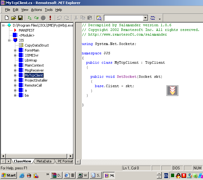 用salamadar打开,已经明显看到一个名为MyTcpClient, 从System.Net.Sockets.TcpClient继承(MytcpClients.cs-Remotesoft.NET Explorer