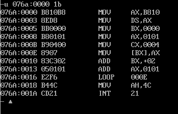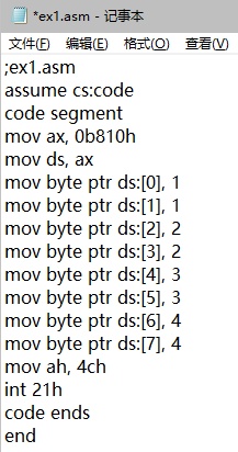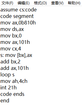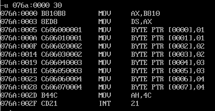 assume cs:code code segment mov ax, 0 mov ds, ax mov bx, 200h mov ax, 0 mov cx, 40h s: mov [bx] ,al inc ax inc bx loop s mov ax, 4c00h int 21h code ends end