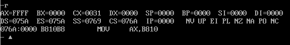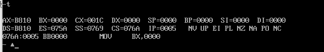 可以发现 CX= 0031H,则指令长度为31,CS:IP为076A:0000,表示第一条指令地址