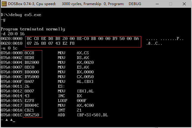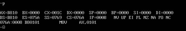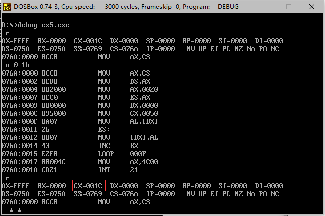 可以发现(CX)=1c,指令长度为1c,(CS:IP)=076A:0000H