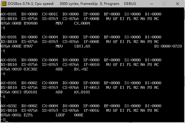 使用p命令,类似T命令,不过遇到子程序调用的时候直接执行完子程序代码,不会进入子程序逐条执行,可以理解为step over。另外,在遇到循环指令时,会直接执行到CX=0。
