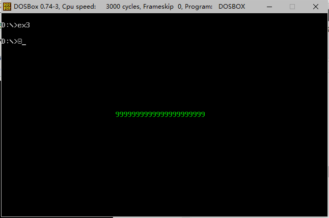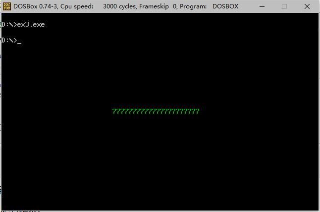 assume cs:code code segment mov ax, 0b800h mov ds, ax mov bx, 07b8h mov ax, 0237h mov cx, 16h x: mov [bx], ax add bx, 2h loop x mov ah, 4ch int 21h code ends end 经过汇编和连接得到ex3.exe文件,