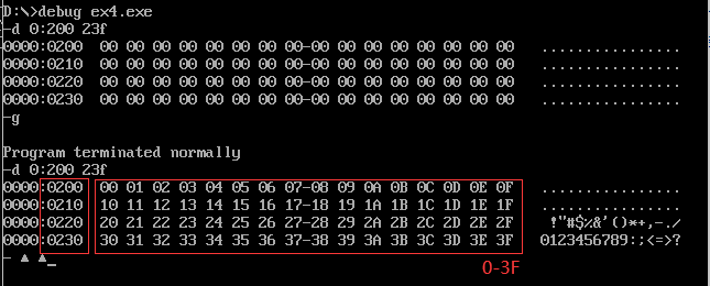 使用g命令运行程序,可以发现0:200-0:23F内存中的内容被替换为了0-3F