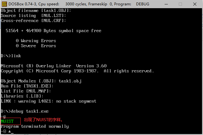 经过汇编、连接得到task3.exe可执行文件,反汇编