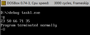 assume cs:code,ds:data data segment db 23,50,66,71,35 data ends code segment start: mov ax,data mov ds,ax mov di,0 mov cx,5 s1: mov ah,0 mov al,ds:[di] mov bl,10 div bl //拆分字符串 mov ds:[10+di],al mov ds:[11+di],ah mov ah,2 mov dl,ds:[10+di] add dl,30h int 21h //输出字符 mov ah,2 mov dl,ds:[11+di] add dl,30h int 21h //输出字符 mov ah,2 mov dl," " int 21h //输出空格 inc di loop s1 mov ax,4c00h int 21h code ends end start