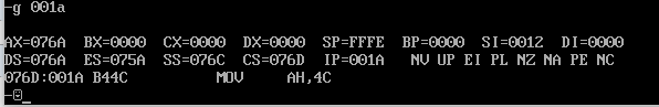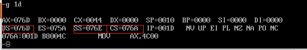 使用 -g 1d执行程序,得到 CS=076CH,SS=076BH,DS=076AH