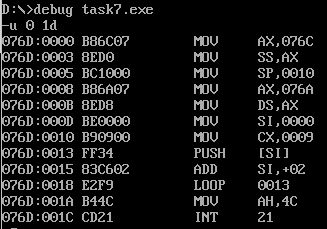 assume cs:code a segment dw 1,2,3,4,5,6,7,8,9,0ah,0bh,0ch,0dh,0eh,0fh,0ffh a ends b segment dw 8 dup(0) b ends code segment start: mov ax,b mov ss,ax mov sp,10h mov ax,a mov ds,ax mov si,0 mov cx,9 s: push ds:[si] add si,2 loop s mov ah,4ch int 21h code ends end start