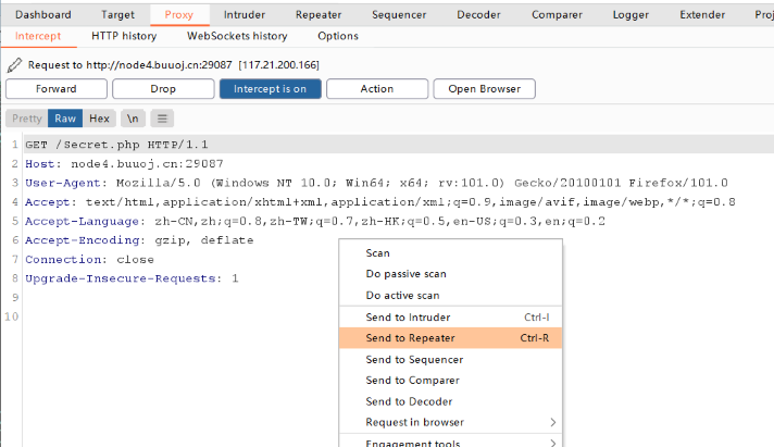 4.打开burpsuite进行抓包,将包发送到重发器中: