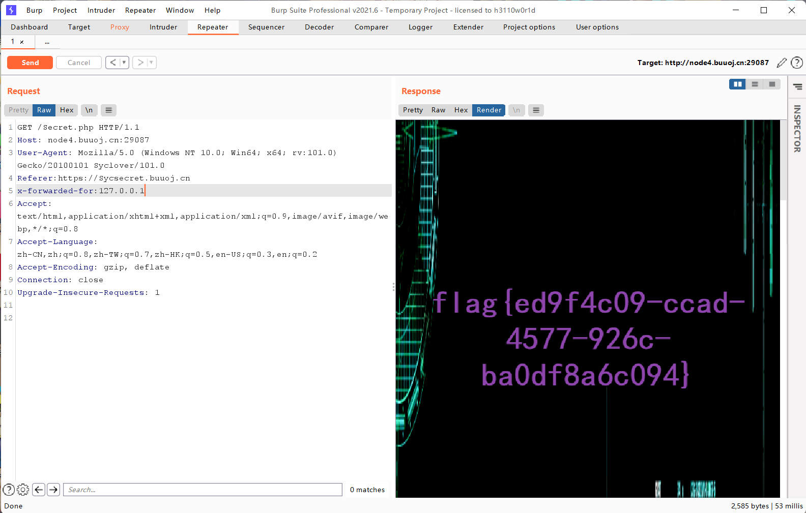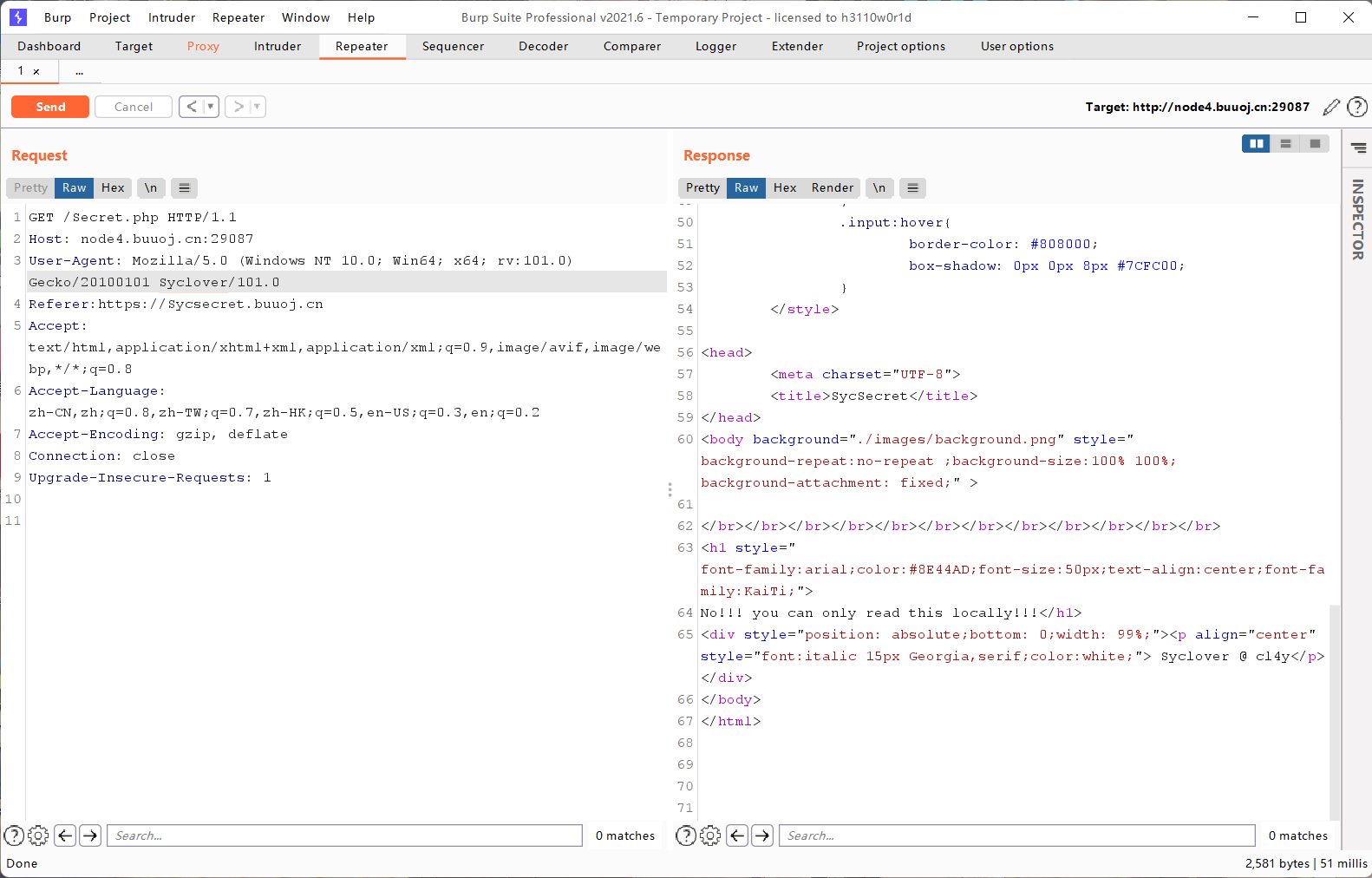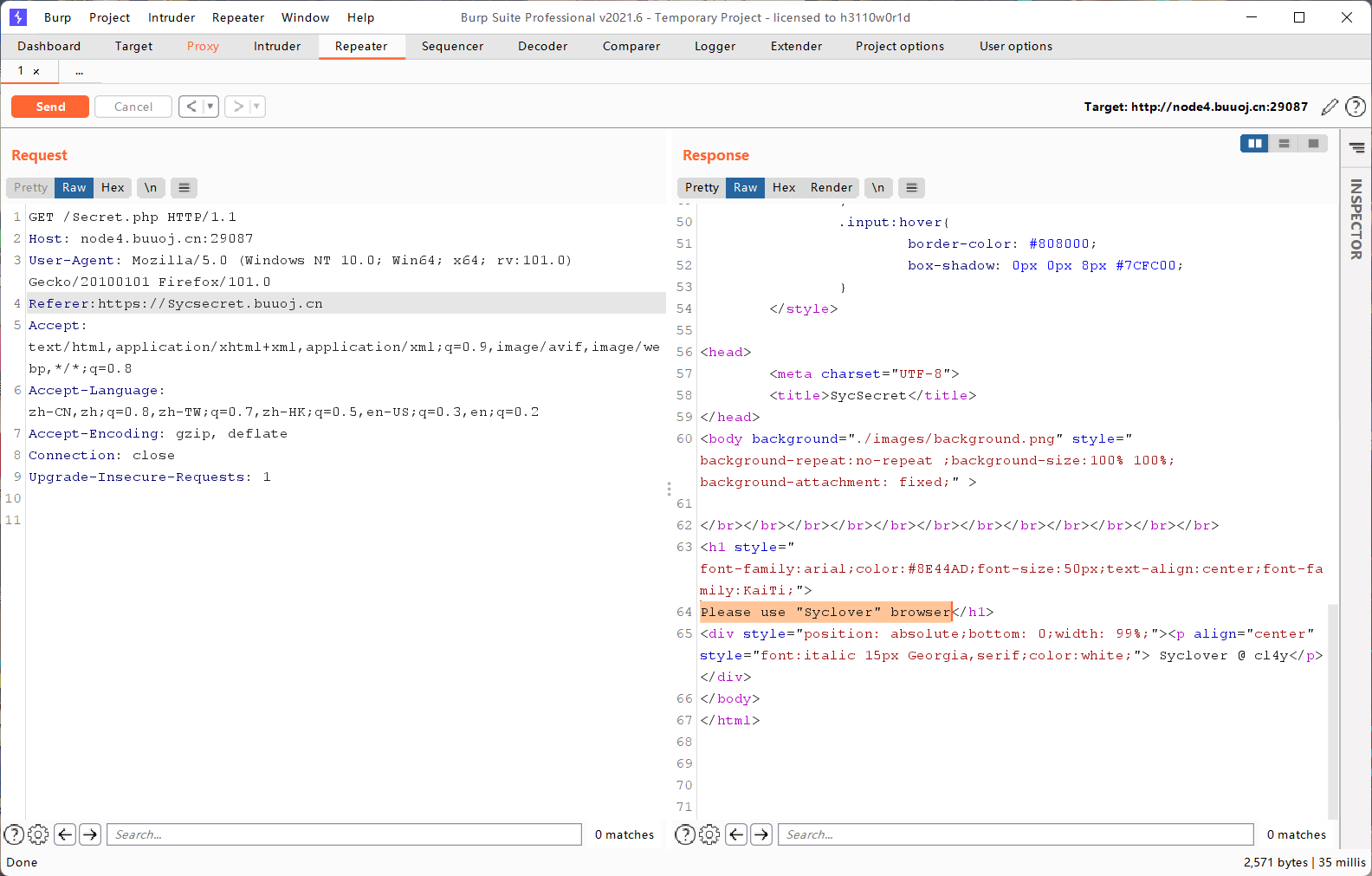 5.在头部输入Referer:https://Sycsecret.buuoj.cn,点击发送,可以看到需要使用Syclover浏览器: