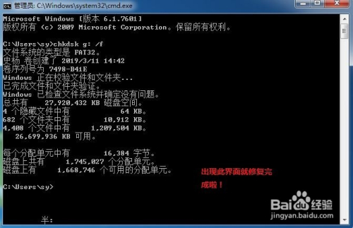 注:不要使用窗口下的chkdisk,因为会出现文件占用的问题。如果不能重启机器,使用cmd下运行。