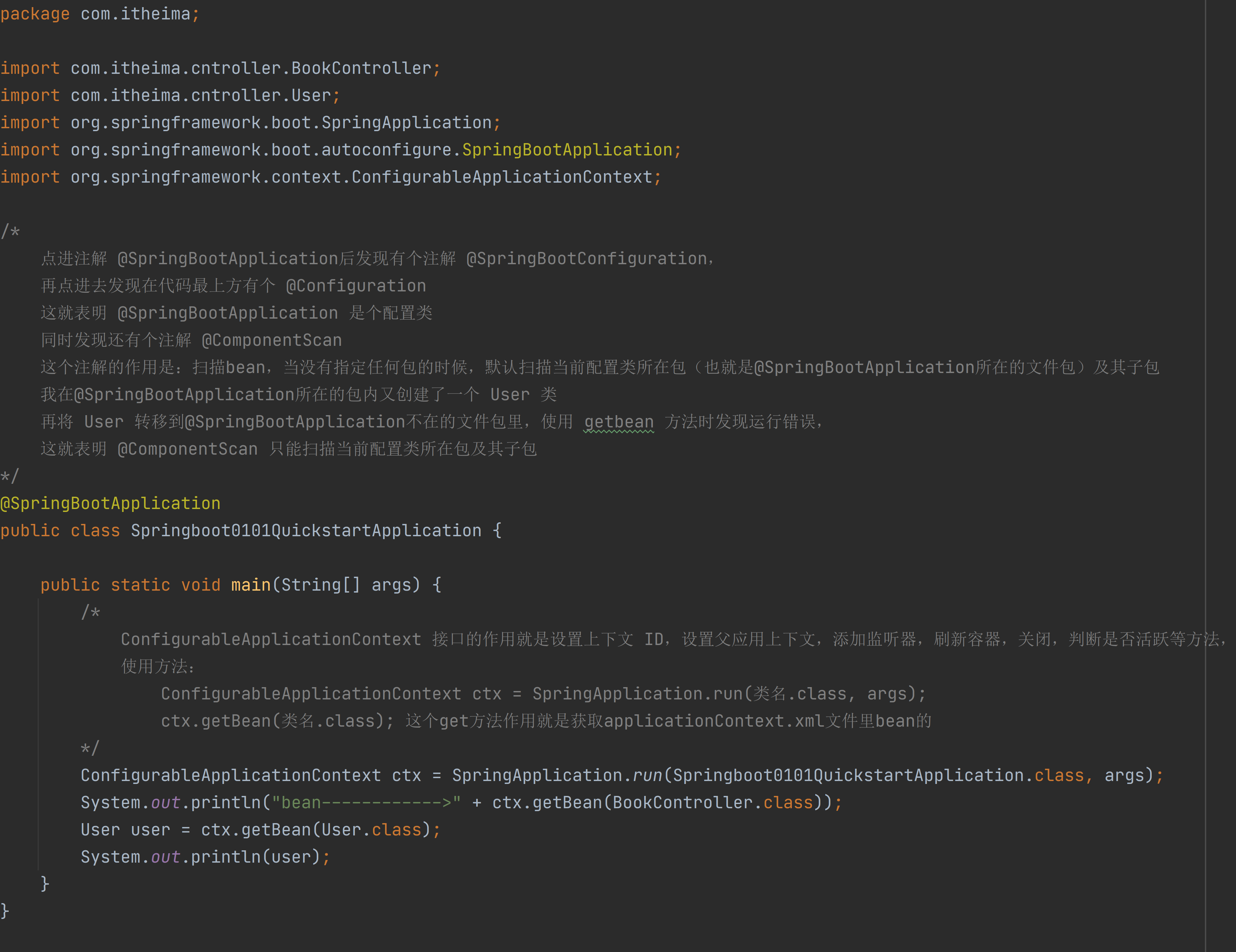 ConfigurableApplicationContext ctx = SpringApplication.run(Springboot0101QuickstartApplication.class, args); System.out.println("bean------------>" + ctx.getBean(BookController.class));