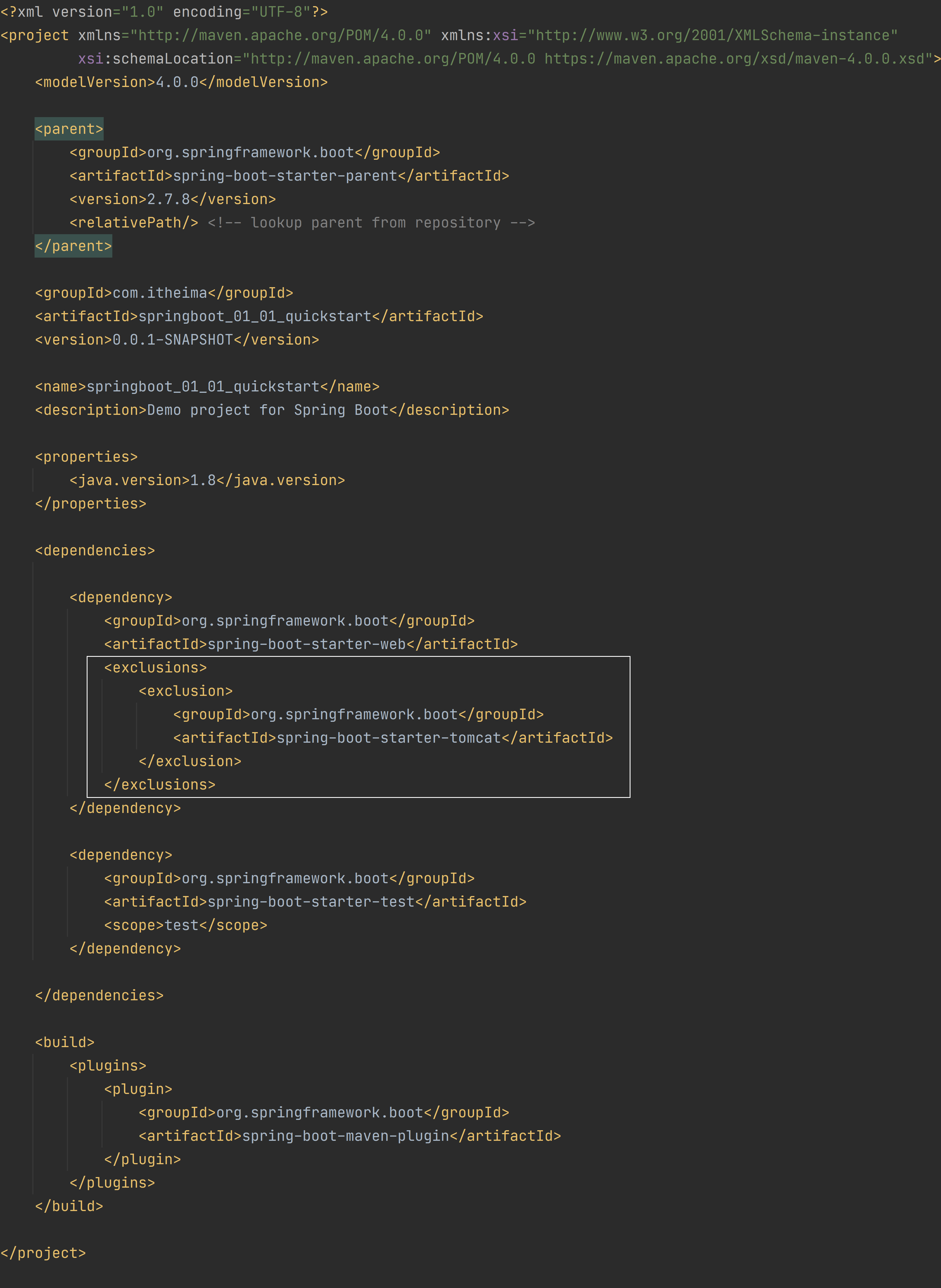 白框区域,就是排除某个依赖,由于 Tomcat 的依赖是spring-boot-starter-web 里的,因此直接在spring-boot-starter-web下方添加排除依赖标签