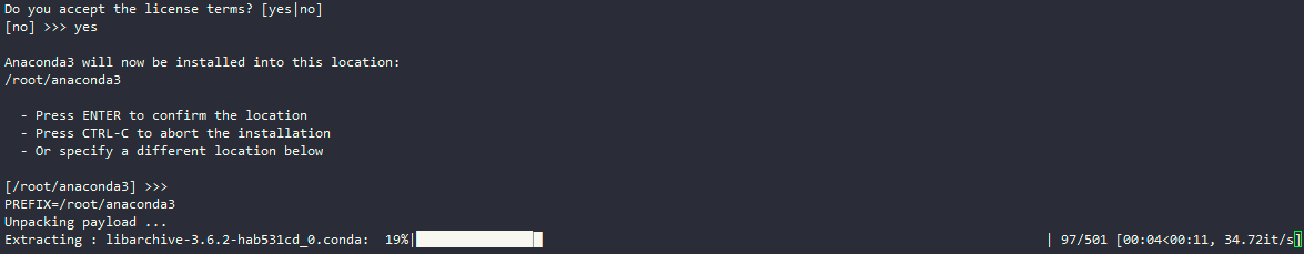 按照说明一路向下回车,直到显示:Do you accept the license terms? [yes|no],输入yes,回车,等待安装